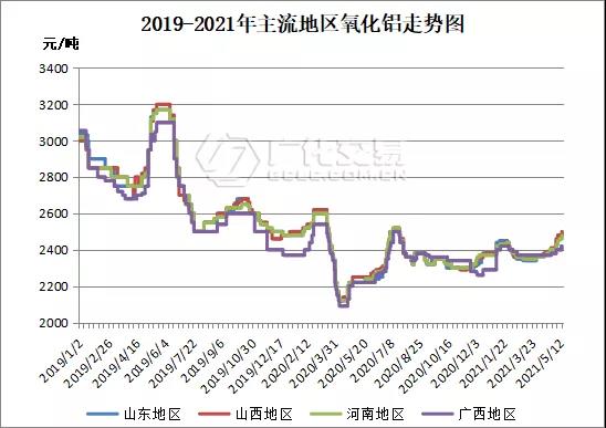 3、5月份以來,主流地區(qū)氧化鋁價(jià)格均出現(xiàn)不同程度的上漲,幅度在40-100元/噸。截止5月19日,山東地區(qū)主流價(jià)格2440-2500元/噸,山西地區(qū)主流價(jià)格在2400-2500元/噸,河南地區(qū)主流價(jià)格在2440-2480元/噸,廣西地區(qū)主流價(jià)格2400-2440元/噸,貴州地區(qū)主流價(jià)格在2390-2410元/噸。